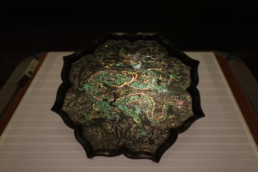 黑漆螺钿海水龙纹菱花形盘通体髹黑漆,用螺钿的不同色泽表现纹饰,盘心以螺钿描绘波涛汹涌五爪巨龙,龙首覆青白、红、绿贝片表现眼颌,龙身绿鳞红鳍,造型富有气势。