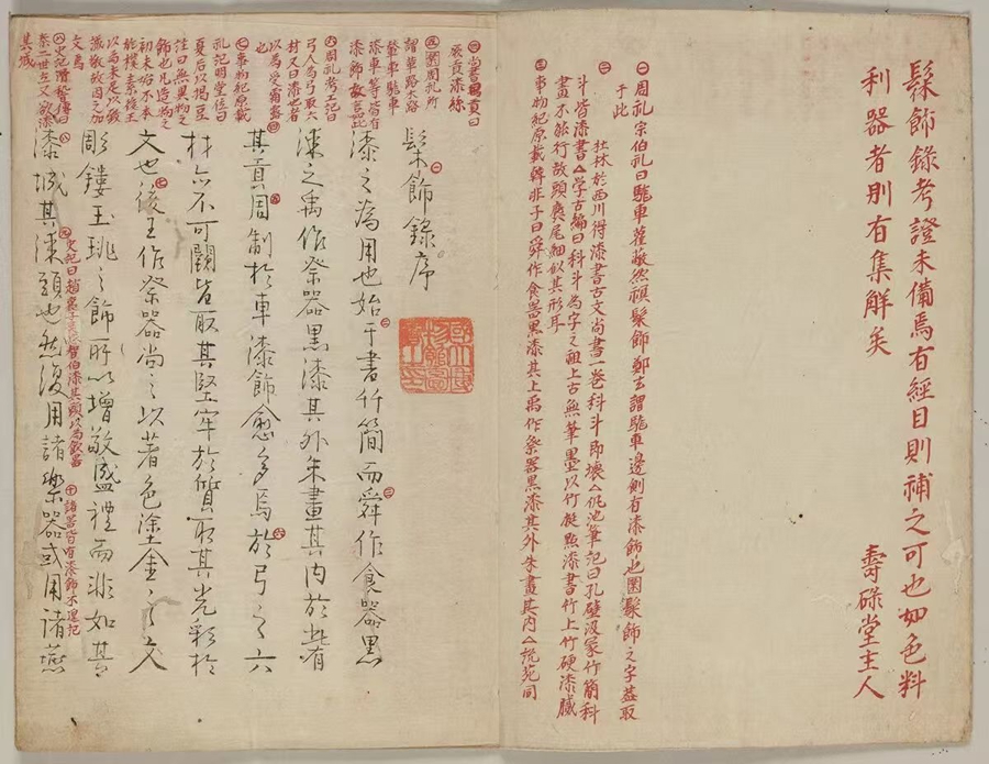 除了漆器珍品,研究中国漆工历史的重要著作《髹饰录》亦现身展厅。该书为明代黄大成所著、杨明作序并注。其原著于中国已散佚,现东京国立博物馆藏有《髹饰录》两种抄本,都在此次展览中亮相。