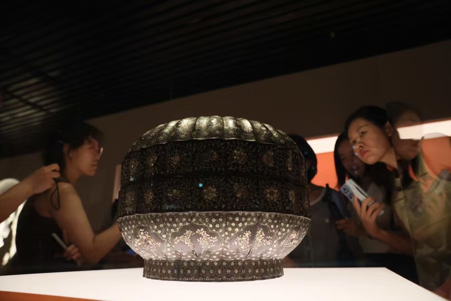 本次亮相的一件元代的黑漆螺钿人物菱花形盒,展期仅两周,想要一睹真容的观众需要赶在10月12日前参观。这件漆器体积大、造型优美、纹饰精细,画面中有龙旗和凤旛,讲述的是皇帝和妃嫔的故事,刻画非常细致,连最下面的连珠纹上都雕了纹饰,做这样的一件螺钿漆器可能要耗费几年时间。