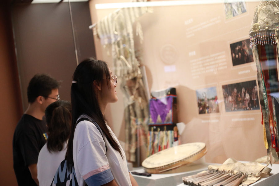 走进展厅,仿佛来到了一个多彩的民族村。鄂伦春、达斡尔、赫哲等民族以质朴自然色调还原“白山黑水”意境,柳编筐、簸箕等日常用品让这里的生活悄然苏醒;京族展区以群青为底色,仿佛北部湾的海风拂面,沁人心脾;云南部分运用热情的红白配色,呼应这片土地上热烈而奔放的民族性格;高山族及尾厅则选用象征团结的中国红,传递出各民族交流交融交往的深厚情感。不仅如此,展览还展示了不同地区的实景照片,搭建了白桦林与兰屿海滩等场景,让观众参观过程中“移步换景”,每处转角皆有一番崭新天地;将鄂伦春族的传统建筑“斜仁柱”搬进了展厅,观众可以走进其中,体验原生态的鄂伦春生活场景。