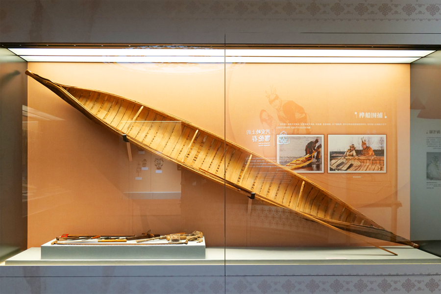 鱼皮服饰是赫哲族文化的重要标志,其制作过程包括选鱼皮、剥鱼皮、阴干鱼皮、鞣制鱼皮、裁剪与拼缝、装饰加工等工序。此次展览不仅展示了鱼皮衣的制作工具,还展示了鱼皮裤、鱼皮绑腿、鱼皮荷包、鱼皮画、鱼皮手套等精美馆藏,突显了赫哲人的生存智慧。