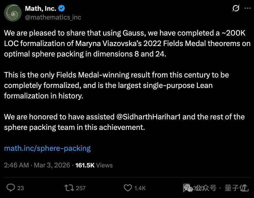 [1]https://x.com/mathematics_inc/status/2028542388717986135[2]https://www.math.inc/sphere-packing— 完 —